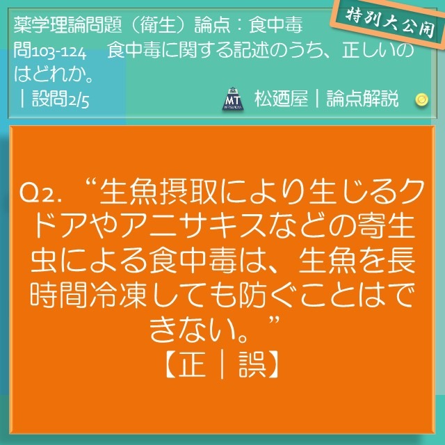 Q. 2. 生魚摂取により生じるクドアやアニサキスなどの寄生虫による食中毒は、生魚を長時間冷凍しても防ぐことはできない。A.【正|誤】|
