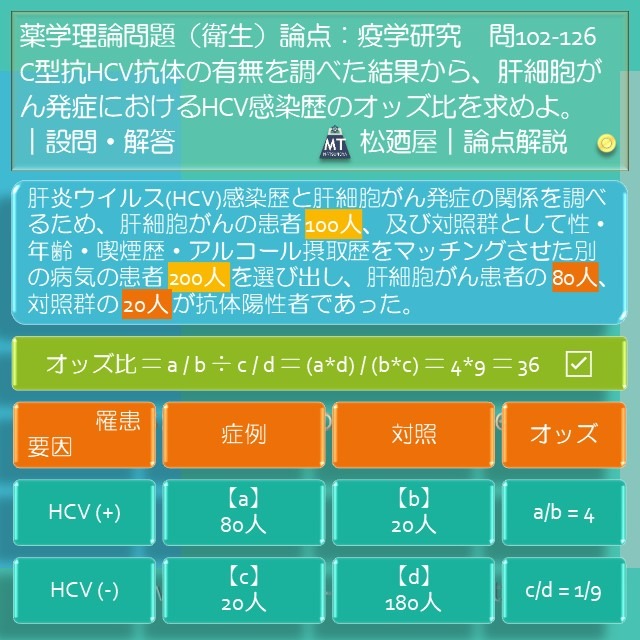第102回薬剤師国家試験|薬学理論問題 / 問126 Q. C型肝炎ウィルス(HCV)感染歴と肝細胞がん発症の関係を調べるため、ある病院において、肝細胞がんの患者 100人、及び対照群として性・年齢・喫煙歴・アルコール摂取歴をマッチングさせた別の病気の患者 200人を選び出し、抗HCV抗体の有無を調べた。その結果、肝細胞がん患者の80人、対照群の20人が抗体陽性者であった。この調査から求められる肝細胞がん発症における HCV感染歴のオッズ比として、正しいのはどれか。