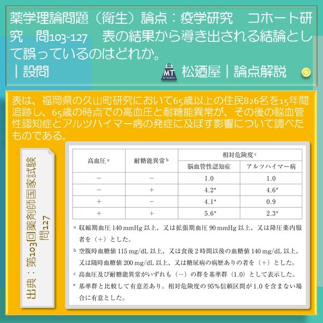 第103回薬剤師国家試験|薬学理論問題 / 問127 Q. 表は、福岡県の久山町研究において65歳以上の住民826名を15年間追跡し、65歳の時点での高血圧と耐糖能異常が、その後の脳血管性認知症とアルツハイマー病の発症に及ぼす影響について調べたものである。この結果から導き出される結論として誤っているのはどれか。