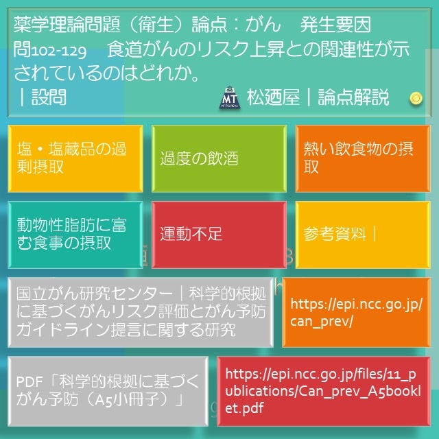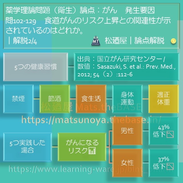 こんにちは!薬学生の皆さん。BLNtです。解説します。薬剤師国家試験の衛生からがんの発生要因を論点とした問題です。第102回薬剤師国家試験の問129(問102-129)は、食道がんのリスク上昇との関連性が示されているがんの発生要因の理解を問われました。