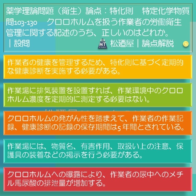 第103回薬剤師国家試験|薬学理論問題 / 問130 Q. 平成26年の特定化学物質等障害予防規則(特化則)の改正により、クロロホルムが特定化学物質に指定され、ベンゼンなどの発がん物質と同様の管理が必要となった。クロロホルムを扱う作業者の労働衛生管理に関する記述のうち、正しいのはどれか。
