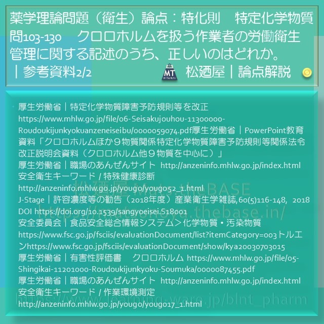 こんにちは!薬学生の皆さん。BLNtです。解説します。第103回薬剤師国家試験 問130(問103-130)は、薬学理論問題の衛生から、労働安全衛生法施行令(政令、原文:e-Gov|http://elaws.e-gov.go.jp/search/elawsSearch/elaws_search/lsg0500/detail?openerCode=1&lawId=347CO0000000318_20170803_429CO0000000218)および特定化学物質障害予防規則(特化則、原文:e-Gov|http://elaws.e-gov.go.jp/search/elawsSearch/elaws_search/lsg0500/detail?lawId=347M50002000039)の改正に関する理解を問う問題です。論点として、労働基準/安全・衛生から「職場における化学物質対策」が問われました。発がん性物質であるクロロホルムを扱う作業者の労働衛生管理を問う問題です。