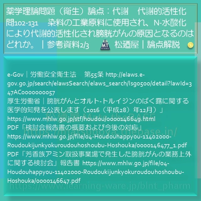 次に、問102-131の正答とされている(参考資料:第102回薬剤師国家試験 試験問題正答 https://www.mhlw.go.jp/file/06-Seisakujouhou-11120000-Iyakushokuhinkyoku/20170626-7.pdf )選択肢3(問102-131-3)、選択肢5(問102-131-5)について設問の記述と関連する論点の概要を解説します。選択肢3(問102-131-3)は、o-トルイジン(o-toluidine|IUPAC名:2-methylaniline)です。問102-131では、染料などに使用される芳香族アミンの代謝的活性化と膀胱がんの発現に関する理解が問われました。福井県の化学工場において、o-トルイジンを取り扱う業務に従事していた労働者に発症した膀胱がんの労災請求(7件)があり、この災害事例について、業務が原因かどうか(労災認定)を判断するため、厚生労働省は、国際的な報告や疫学調査結果などを分析・検討し報告書にまとめました(2016(平成28)年12月21日提出)。厚生労働省の「芳香族アミン取扱事業場で発生した膀胱がんの業務上外に関する検討(労災認定に関する検討)」の事案です。この事案に関する報告書を受け、福井県の労災認定に関する厚生労働省からの指示があり、また、職場における化学物質管理において、o-トルイジン(o-toluidine)は、労働安全衛生法の特定化学物質/特定第2類物質・特別管理物質に追加されました(政令改正:2017(平成29) 年1月施行)。当該の政令改正の1か月後、第102回薬剤師国家試験は、平成29年2月25日、26日に実施され、この論点(染料などの工業原料o-トルイジンによる化学工場での膀胱がん)が問われています。薬剤師国家資格要件に対する適合性を検出する目的としては、この時点で労働災害と関連してo-トルイジン(o-toluidine)と膀胱がんに関する論点の理解を求めるのは、作問時点では審議段階であったことが推察され、職能を検出する問題としては時期尚早で、適切さに対する疑問が生じることは否めないと思われます。コアカリキュラムの中での習得を想定すると、あまりにもオンタイムなトピックです。化学物質の発がん性に起因する労働災害認定は、公衆衛生において重大なテーマなので、o-トルイジンは知っておくべき化学物質ですが、タイミングとして、改正の1~2年後、第103回または第104回薬剤師国家試験で、はじめて出題して習得・周知徹底を問うのが妥当です。