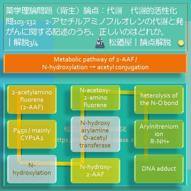2-AAFは、P450(CYP)によってN-水酸化を受けて、N-ヒドロキシ-2-アセチルアミノフルオレン(N-OH-2-AAF|図1: 化合物6)へと代謝されます。芳香族アミンおよびヘテロサイクリックアミンのN-水酸化には、主にCYP1A2が関与すると考えられています(文献1-3)。一方で、CYPは基質特異性が低いので、CYP3A4が2-AAFのN-水酸化に関与しないかどうかは研究論文としてネガティブデータが示されないと否定できないです。芳香族アミン(または、ヘテロサイクリックアミン)のN-水酸化にCYP1A2が関与することを、薬剤師国家試験においてコアカリキュラムの習得度合いの要件とするのであれば、選択肢の記述(のあるべき姿)は、「2-AAFは、ヒトでは主にCYP1A2によってN-水酸化体に代謝される(かもしれない、可能性がある)。」として「正」を選ばせれば妥当な記述かと思われます。2-AAFが、CYP3A4(しかも、動物種・臓器を示していない記述)によって代謝されないという「ネガティブデータ」を知っていることは、薬剤師に求められる要件ではないです。問103-132-1の記述「2-アセチルアミノフルオレンは CYP3A4によりN-水酸化体に代謝される。」は、クリアカットな記述ではない印象を受けます。「マイナーな代謝経路かもしれないけれど、もしかしたら、何かのCYP3A4で代謝されるかもね。マル付けようかな。」と考える皆さんのほうが薬学の(代謝に関する)センスは良いです。文献2によれば、” We used cyt P450 1A2 supersomes for 2-AAF to replace cyt P450 3A4 since cyt P450 1A2 is the major cyt P450 responsible for metabolism in human liver. A significantly larger rate of DNA damage was found for cyt P450 1A2 compared to cyt P450s 2A6, 3A5 and 1B1, suggesting a higher rate conversion by 1A2 leading to reactive metabolites.”とのことです。2015年の文献ですが、実際にヒトCYP分子種を使って実験で、CYP 2A6、 3A5および1B1と比較して、CYP1A2が2-AAFの代謝的活性化によるDNA付加体生成に最も寄与したとしています(文献1: Fig. 3)。文献1のFig. 3の結果から推察されることは、ヒトCYP2A5、3A5および1B1によっても2-AAFは代謝を受けて代謝的活性化が起きDNA付加体が生成しているということです。発がん物質の代謝の総説として論文3(2012)がありました。論文3のTable1では、2-AAFのN-水酸化に関与する薬物代謝酵素をCYP1A1およびCYP1A2とし、また、N-水酸化の後のO-アセチル化に関与する酵素をNAT1としています。走り読みしてみると全体の理解が深まります。なお、CYP3A4は、ヒト肝臓では最も(量的に)主要なCYP分子種です。