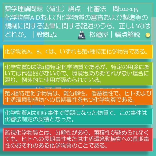 松廼屋|論点解説 薬剤師国家試験対策ノート問99-21【衛生】論点:化審法 / 化学物質の分類