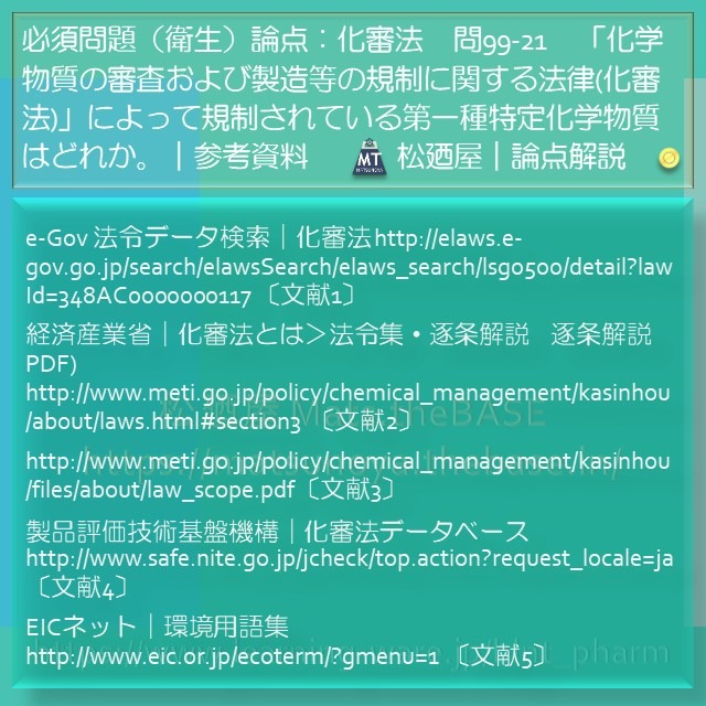 こんにちは!薬学生の皆さん。BLNtです。解説します。薬剤師国家試験の衛生から化学物質の審査および製造等の規制に関する法律(化審法)e-Gov 法令データ検索|化審法 http://elaws.e-gov.go.jp/search/elawsSearch/elaws_search/lsg0500/detail?lawId=348AC0000000117 〔文献1〕を論点とした問題です。新薬剤師国家試験(97回-103回)に合計5問出題されました。化学物質の審査および製造等の規制を定めた化審法は、薬剤師国家試験において頻出する重要な論点です。化審法を論点とする問題(問99-21、100-21、101-23、97-134、102-135)から、第99回薬剤師国家試験 問21(問99-21)を解説します。
