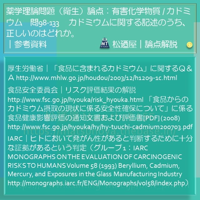 解説します。有害化学物質カドミウムの毒性を論点とした問題です。選択肢4(問98-133-4)では、カドミウムの発がん性の理解が問われました。上記、食品安全委員会の評価書(2008)6.2.6 発がんによれば、今回リスク評価の対象としている一般環境におけるカドミウムの長期低濃度曝露では、明らかに発がん性があるとの結論を導き出すことは難しいと考察されました。一方、1993 年出版の国際がん研究機関(IARC) 文書では、カドミウムは「ヒトにおいて発がん性があると判断するために十分な証拠がある」(Group 1:Carcinogenic to humans)と分類されました。